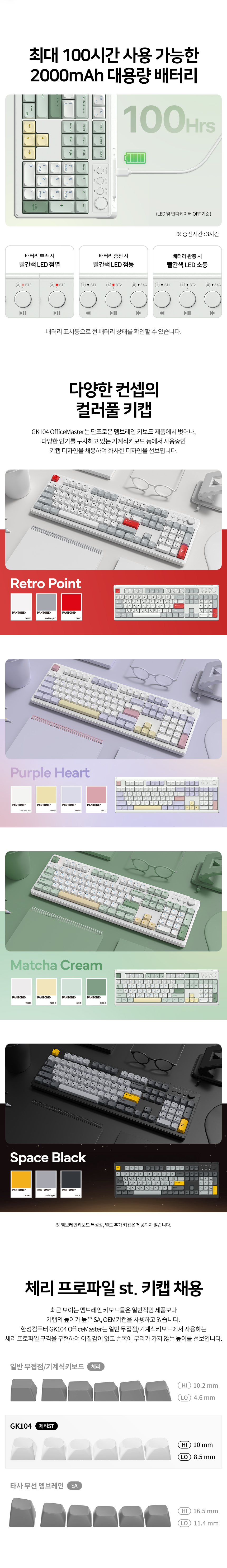 - 접점형태 : 멤브레인 - 각인형태 : 고급 UV각인 및 코팅 - 규격 : 풀배열(104키 + 노브 및 멀티키 3키) - 키수명 : 500만회 이상 - 배터리 : 2000mAh 리튬배터리 - 연결방식 : 유선 / RF 2.4GHz / Bluetooth 5.0 - 수신거리 : 10m - 사용시간 : 100시간 (RGB OFF) - 충전시간 : 3시간 - 사이즈 : 436 X 149 X 17 mm - 무게 : 655g±10g - 구성품 : 키보드본체, USB리시버, - 키스킨, Type-C 케이블, 사용자설명서 - OS지원 : Windows 10이상 / Mac OS X 10.4 이상 - 보증기간 : 구입일로부터 무상 1년 (소모품은 3개월) | 0원 |