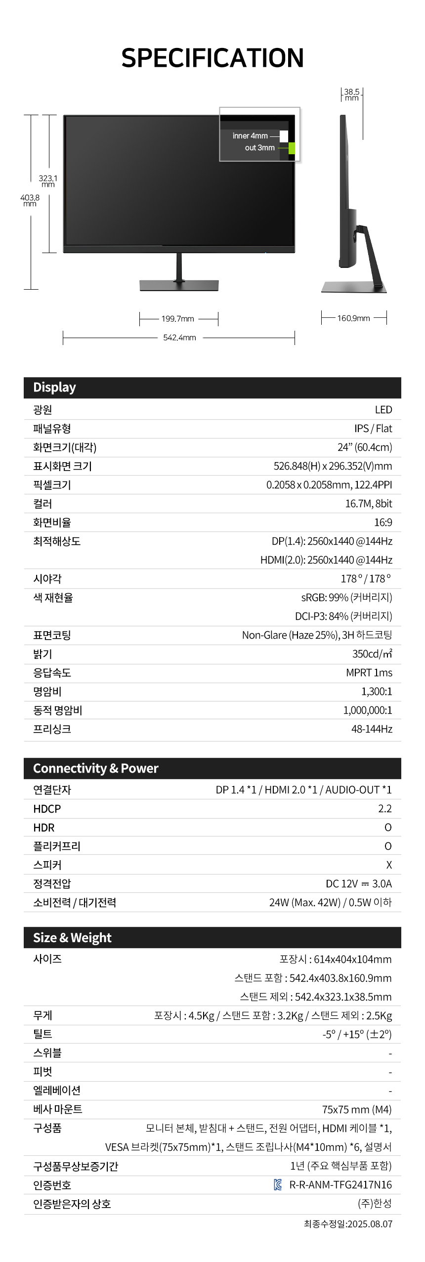 | 품명 및 모델명 | TFG24Q14P | 제조사(수입자/병행수입) | (주)한성 |