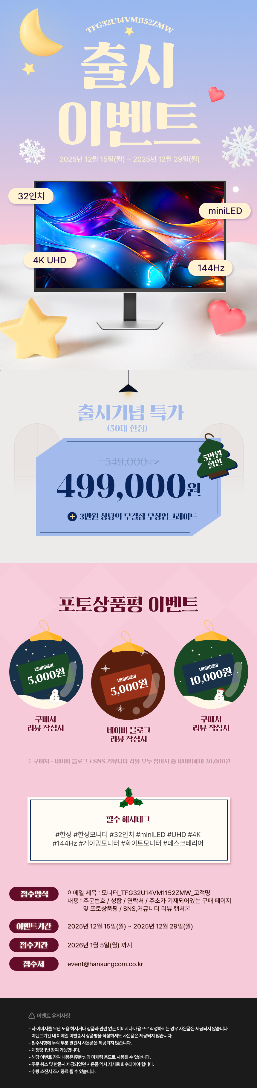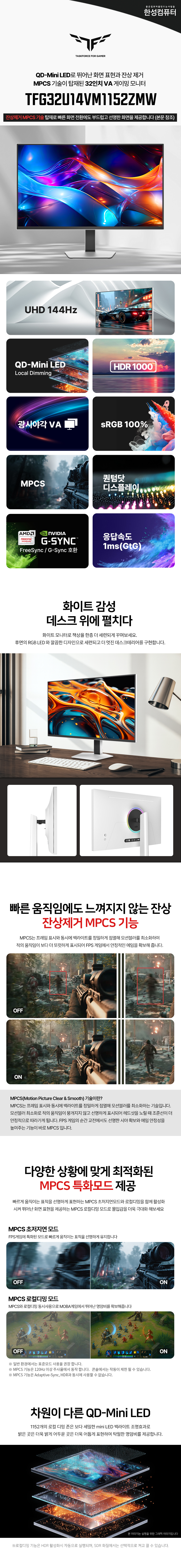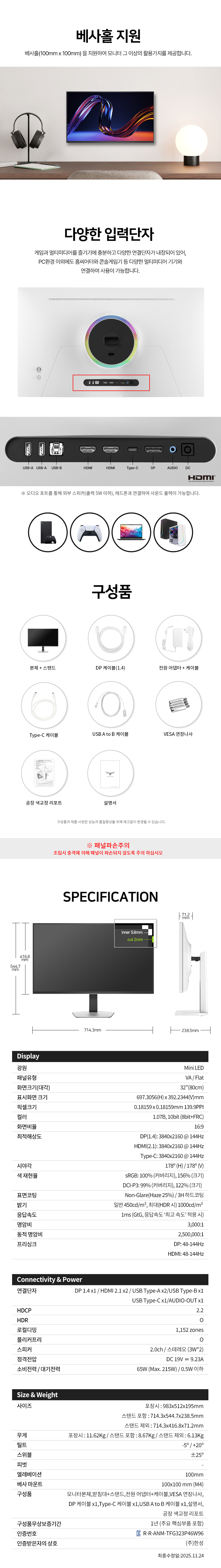 - 80cm(32인치) / 와이드(16:9) / 퀀텀닷 / MiniLED / VA / 평면 / 광시야각 - 3840 x 2160(4K UHD) / 픽셀피치: 0.18159mm / 144Hz / 1ms(GtG) - 1000cd / 3,000:1 / 2,500,000:1 / 플리커 프리 / 블루라이트 차단 - 눈부심 방지 / 논글레어 / HDR / 스피커 / LED 조명 / PBP / PIP - 리모컨 / HDCP 지원 / 무결점 정책 / USB PD 지원 - 엘리베이션(높낮이) / 틸트(상하) / 스위블(좌우) / 베사홀: 100 x 100mm - 65W / 0.5W / 크기(가로x세로x깊이): 715x545x239mm / 8.67kg - [색상영역] 10bit(8bit+FRC) / sRGB: 100% / DCI-P3: 99% - [게임특화] 게임모드 지원 / 조준선 표시 / FreeSync / FreeSync Premium / G-Sync compatible / Adaptive Sync - [단자정보] HDMI 2.1 / DP 1.4 / USB C타입 | 0원 |