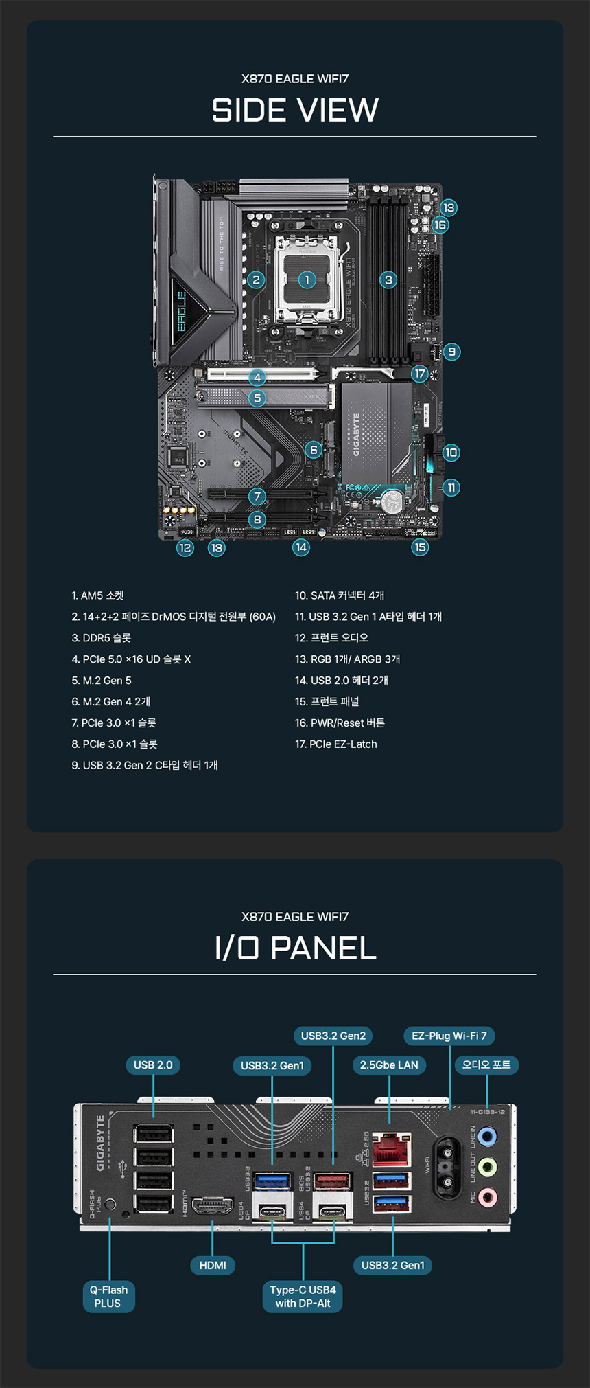 GIGABYTE / AMD(소켓AM5) / AMD X870 / ATX (30.5x24.4cm) / 전원부: 14+2+2페이즈 / 페이즈당60A / Vcore출력합계: 840A / 메모리 DDR5 / 8000MHz (PC5-64000) / 4개 / 메모리 용량: 최대 256GB / XMP / EXPO / 확장슬롯 VGA 연결: PCIe5.0 x16 / PCIe버전: PCIe5.0, PCIe3.0 / PCIex16: 1개 / PCIex16(at x1): 2개 / 저장장치 M.2: 3개 / SATA3: 4개 / M.2 연결: PCIe5.0, PCIe4.0, NVMe , M.2간 레인공유 / 후면단자 HDMI / Type-C / USB4 40Gbps / USB3.x 10Gbps / USB3.x 5Gbps / USB 2.0 / RJ-45 / 오디오잭 / BIOS 플래시백 / USB A타입: 8개 / USB C타입: 2개 / 랜/오디오 유선랜 칩셋: Realtek / 2.5Gbps / RJ-45: 1개 / MediaTek MT7925(at v1.0) / 무선랜(Wi-Fi) / 블루투스 / 오디오 칩셋: Realtek / 7.1채널(8ch) / 내부I/O USB/팬 헤더: USB3.0 헤더 , USB2.0 헤더 , USB3.2 Type C 헤더, ARGB 5V 3핀 헤더 , CPU추가팬(OPT) 헤더 / 시스템팬 4핀: 4개 / I/O 헤더: TPM 헤더, 프론트오디오AAFP 헤더 / 특징 DrMOS / 전원부 방열판 / M.2 히트싱크 / 일체형IO실드 / LED라이트 / UEFI | 0원 |