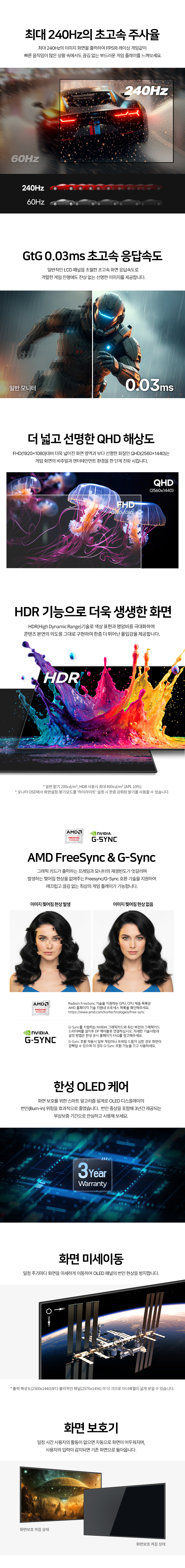 - 일반/무결점 선택가능 - 67.8cm(27인치) / 와이드(16:9) / QD-OLED / 평면 / 광시야각 - 2560 x 1440(QHD) / 픽셀피치: 0.2292mm / 240Hz / 0.03ms(GTG) / PBP / PIP - 200cd(최대400cd) / 1,500,000:1/ 플리커 프리 / 블루라이트 차단 / 눈부심 방지 - 논글레어 / HDCP 지원 / 무결점 정책 / 베사홀: 100 x 100mm / 54W - 피벗(회전) / 엘리베이션(높낮이) / 틸트(상하) / 스위블(좌우) - 크기(가로x세로x깊이): 611*513*221mm - [게임특화] FreeSync / G-Sync compatible / Adaptive Sync - [단자정보] HDMI 2.1 / DP 1.4 | 0원 |