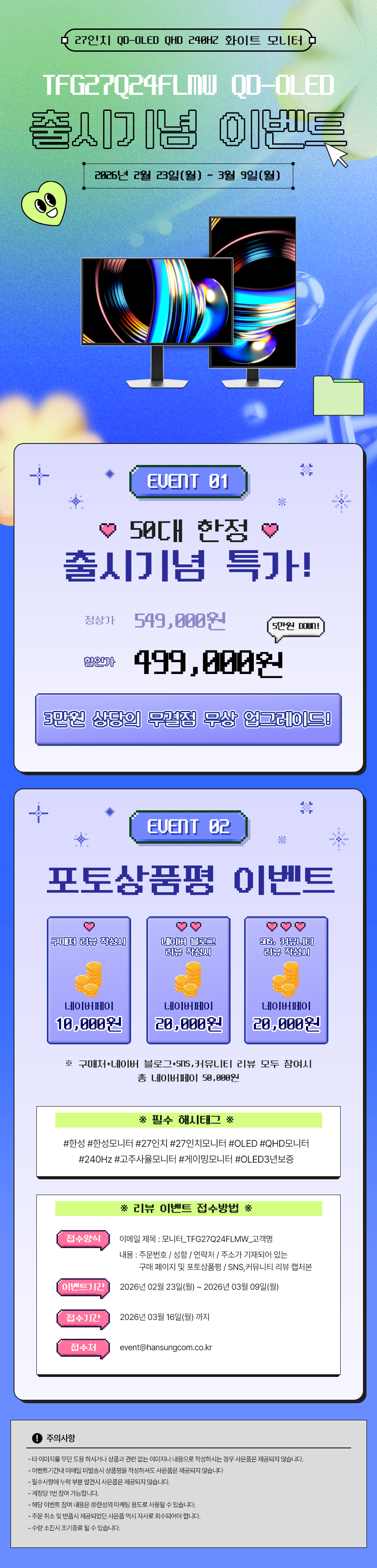 | 품명 및 모델명 | TFG27Q24FLMW QD-OLED | 제조사(수입자/병행수입) | (주)한성 |