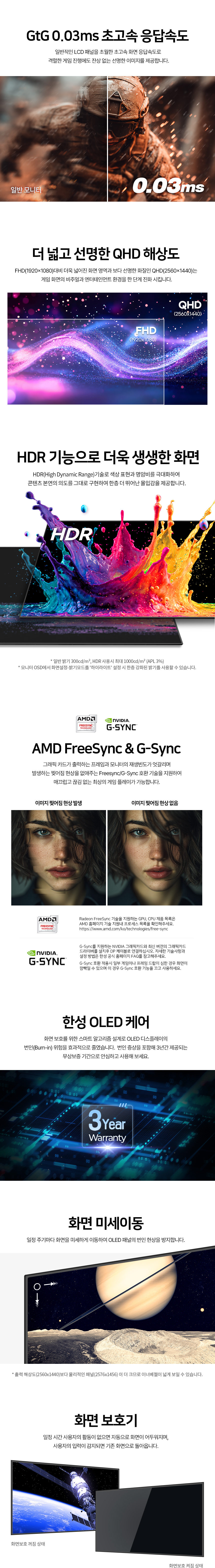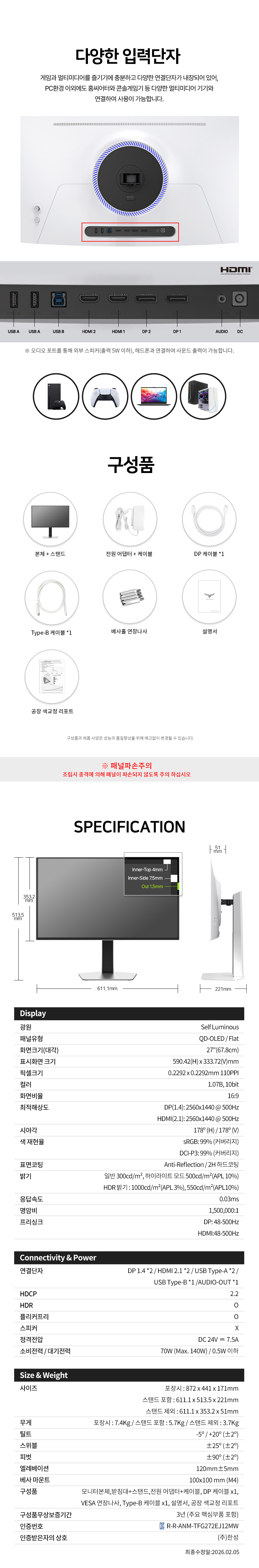- 일반/무결점 선택가능 - 67.8cm(27인치) / 와이드(16:9) / QD-OLED / 평면 / 광시야각 - 2560 x 1440(QHD) / 픽셀피치: 0.2292mm / 500Hz / 0.03ms(GTG) / PBP / PIP - 300cd(최대1000cd) / 1,500,000:1/ 플리커 프리 / 블루라이트 차단 / 눈부심 방지 - 논글레어 / HDCP 지원 / 무결점 정책 / 베사홀: 100 x 100mm / 70W - 피벗(회전) / 엘리베이션(높낮이) / 틸트(상하) / 스위블(좌우) - 크기(가로x세로x깊이): 611*513*221mm - [게임특화] FreeSync / G-Sync compatible / Adaptive Sync - [단자정보] HDMI 2.1 / DP 1.4 | 0원 |