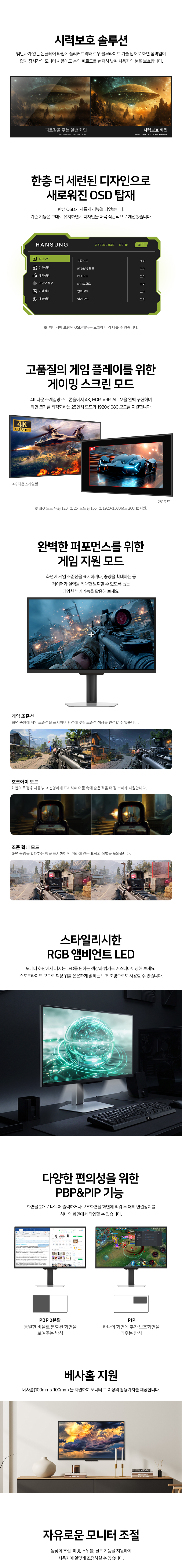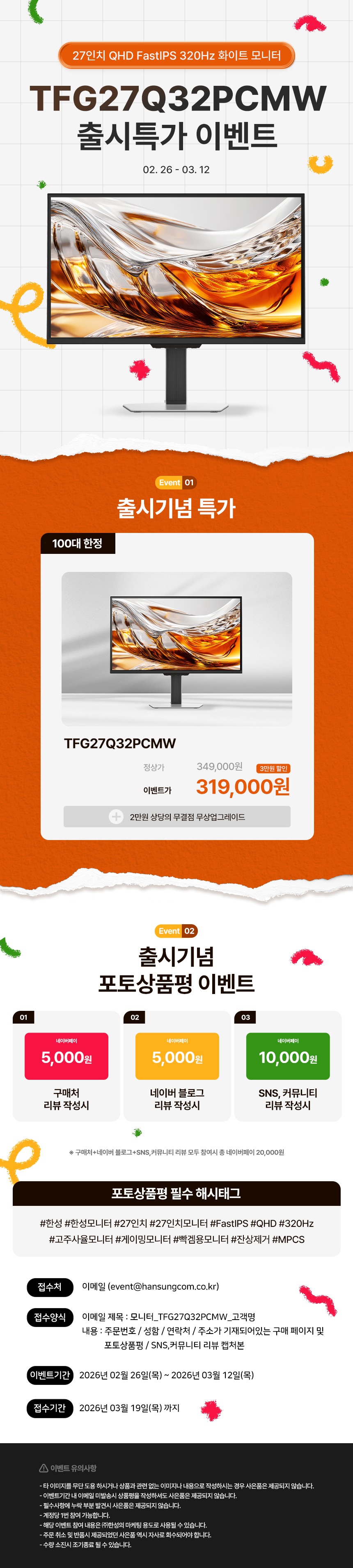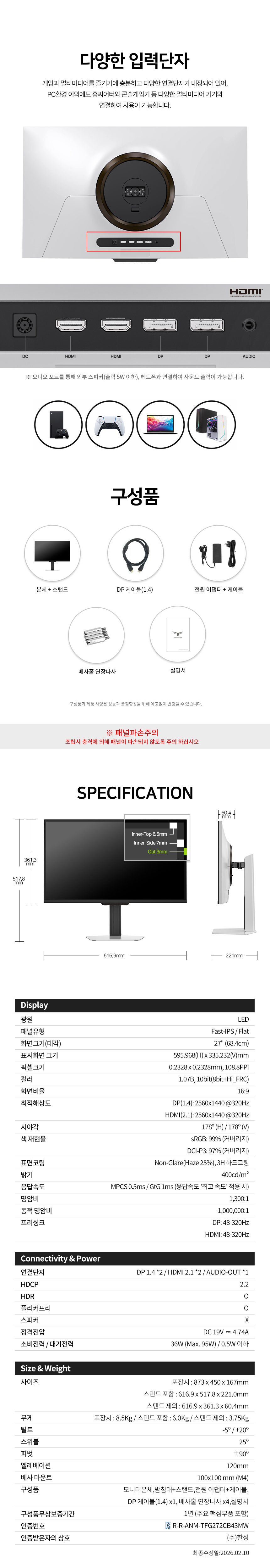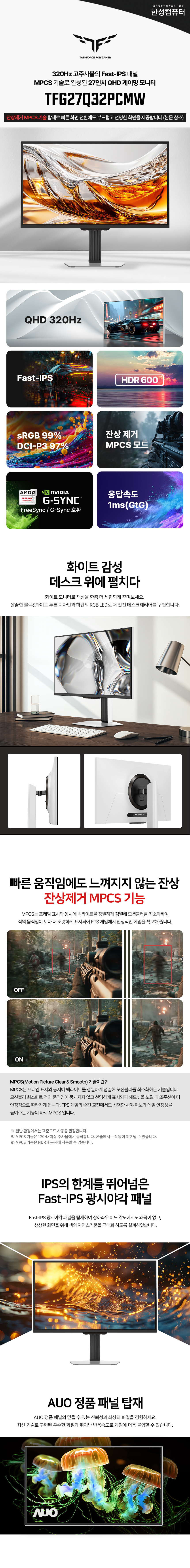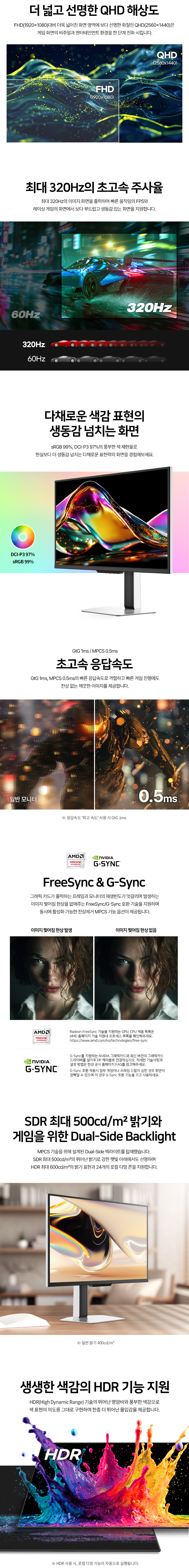 - 일반/무결점 선택가능 - 68.4cm(27인치) / 와이드(16:9) / FastIPS / 평면 / 광시야각 - 2560 x 1440(QHD) / 픽셀피치: 0.2331mm / 320Hz / 0.5ms(MPRT) - 400cd / 1,300:1 / 1,000,000:1 / 플리커 프리 / 블루라이트 차단 / 눈부심 방지 - 논글레어 / HDCP 지원 / 무결점 정책 / 베사홀: 100 x 100mm / 36W - 틸트(상하) / 스위블 / 피벗 / 엘레베이션 - 크기(가로x세로x깊이): 617x518x221mm / 6kg - [색상영역] sRGB: 99% / DCI-P3: 97% - [게임특화] 게임모드 지원 / 조준선 표시 / FreeSync / G-Sync compatible / Adaptive Sync - [단자정보] HDMI 2.1 / DP 1.4 | 0원 |
