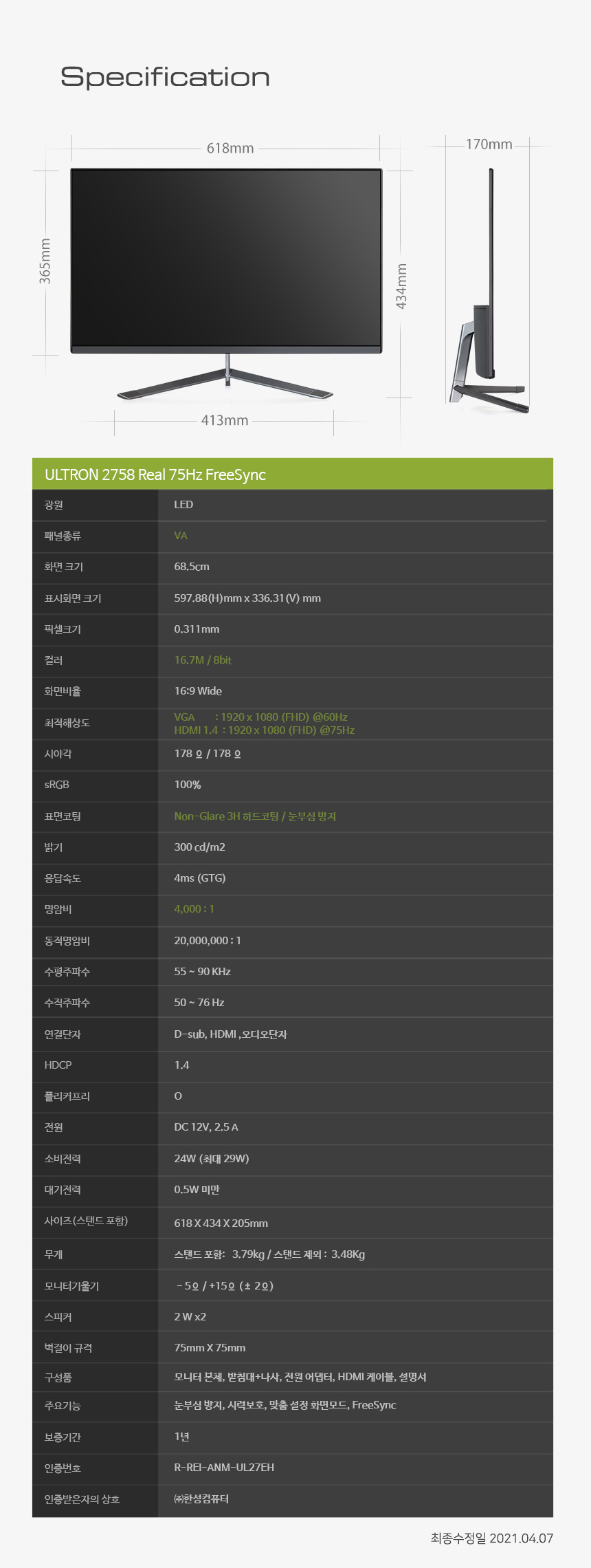 | 품명 및 모델명 | ULTRON 2759G 리얼1ms 144 | 제조사(수입자/병행수입) | |