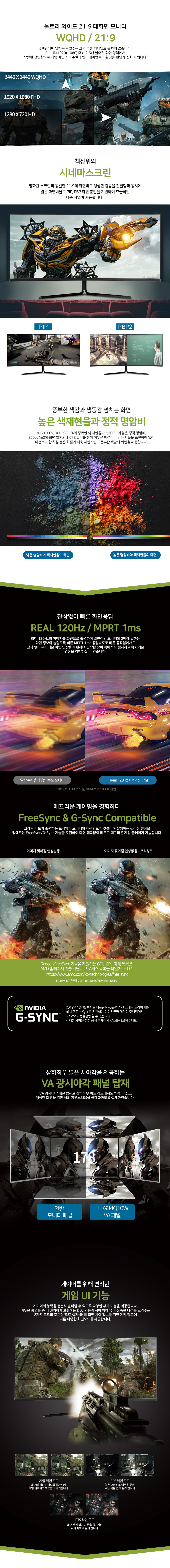- 86.4cm(34인치) / 울트라와이드(21:9) / VA / 커브드 / 1500R - 광시야각 / 3440 x 1440(Ultra WQHD) / 픽셀피치: 0.23175mm - 100Hz / 3ms(OD) / 300cd / 3,000:1 / 1,000,000:1 / 플리커 프리 - 블루라이트 차단 / 눈부심 방지 / 논글레어 / PBP / PIP / 헤드폰 아웃 - HDCP 지원 / 틸트(상하) / 베사홀: 75 x 75mm / 56W / 0.5W - 크기(가로x세로x깊이): 815x437x258mm / 7.02kg - [색상영역] sRGB: 99% / DCI-P3: 85% - [게임특화] 게임모드 지원 / 조준선 표시 / 블랙 이퀄라이저 / FreeSync / G-Sync compatible - [단자정보] HDMI 2.0 / DP | 0원 |