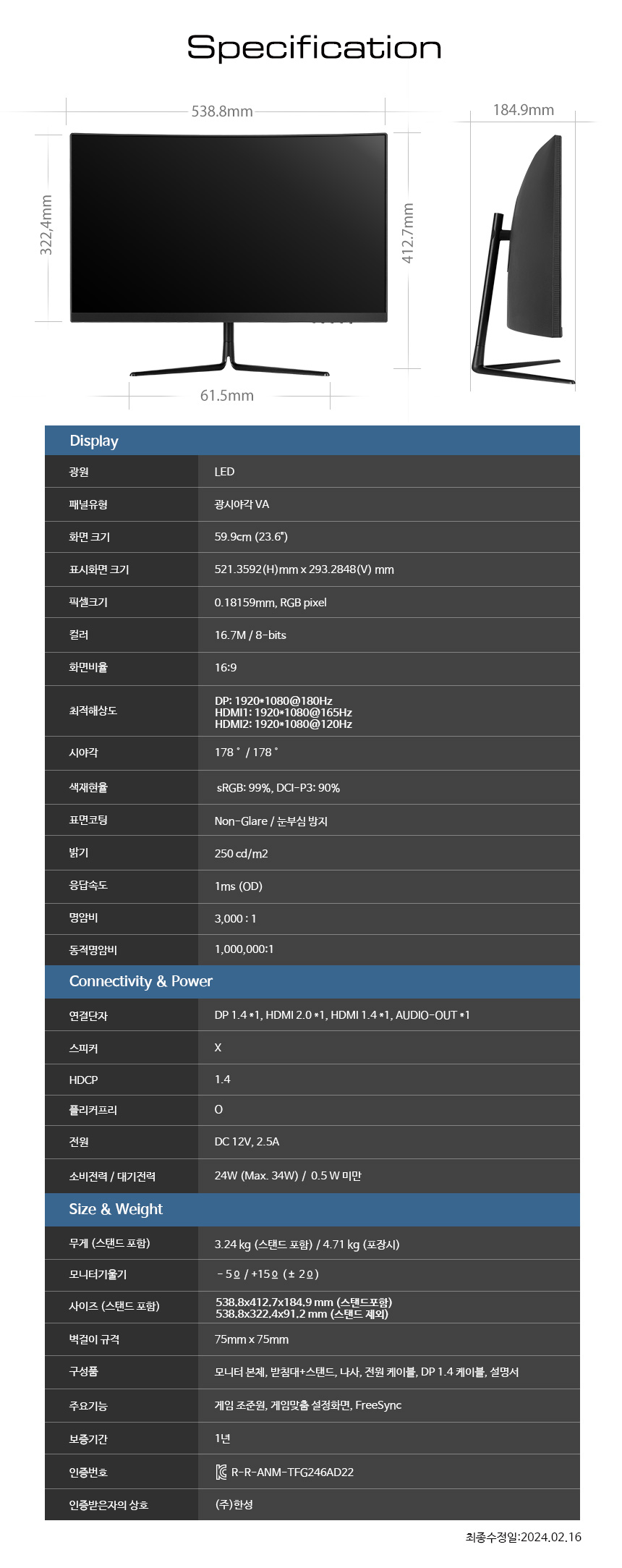 | 품명 및 모델명 | TFG24F14V 1200R 커브드 게이밍 리얼 144 | 제조사(수입자/병행수입) | 한성컴퓨터 |